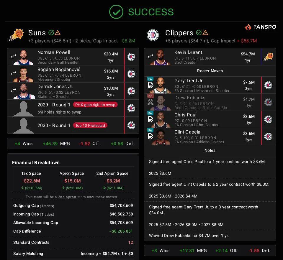 又比如要换杜兰特(还没去火箭),快船可以将鲍威尔+博格丹+小琼斯打包。