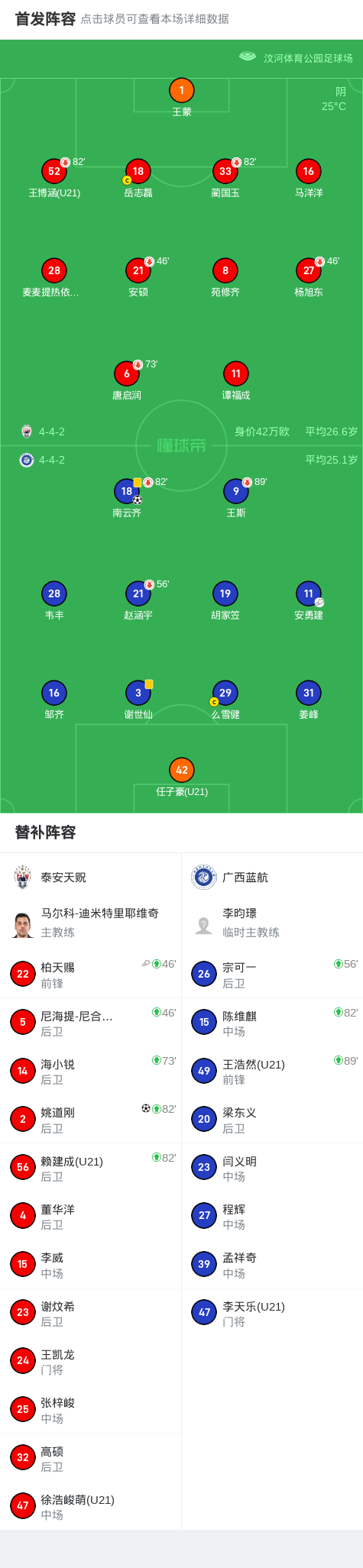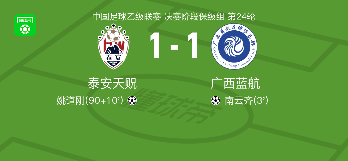 北京时间8月30日中国足球乙级联赛决赛阶段保级组第24轮,泰安天贶主场迎战广西蓝航。比赛开始后,广西蓝航由安勇建助攻南云齐率先破门。下半场补时阶段,泰安天贶由柏天赐助攻姚道刚扳平比分。最终双方以1-1握手言和。