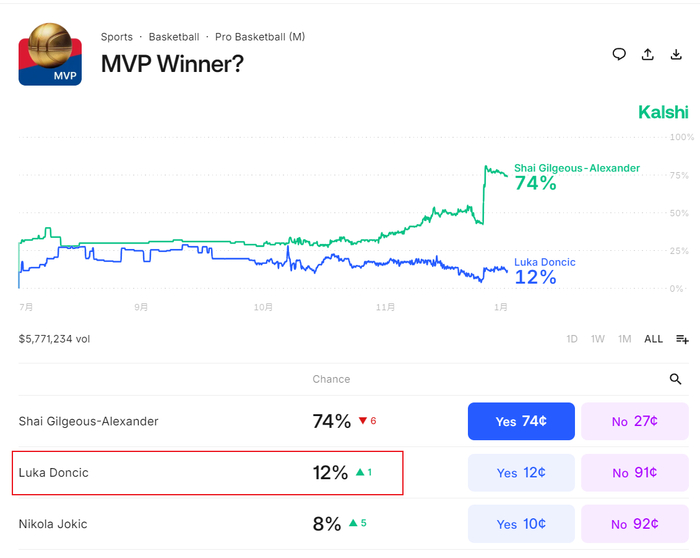 在MVP的概率上,东契奇已经反超约基奇升至第二,但SGA还是断崖的第一,SGA的MVP概率高达74%。
